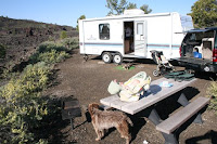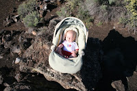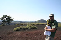 For Brian's first Father's Day he elected to go camping at Crater's of the Moon National Monument, about a 45 minute drive from our house. A spectacular place, it is the remnants of a volcanic explosion that occurred 2,000 years ago (and is still active). The lava flows and cinder cones make for a bleakly beautiful landscape. Interestingly, the volcanic activity that created this eruption is all linked into the geo-thermal activity at Yellowstone National Park.